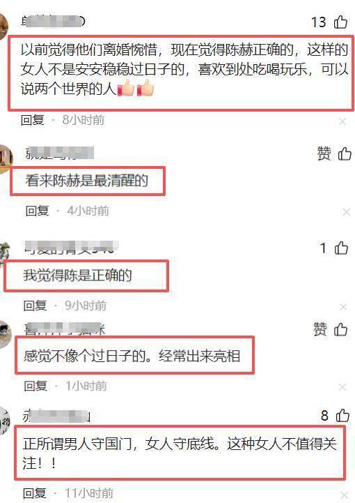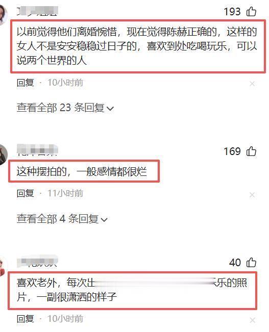 有人说,“每天吃吃喝喝出去玩,一看就不是正经过日子的人,幸亏陈赫离婚了”。