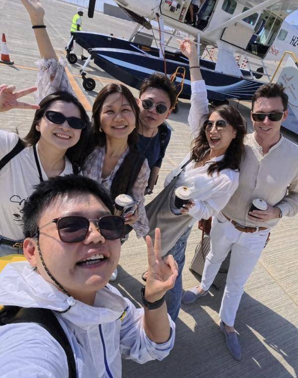 一行人下了飞机后,举手欢呼,拍了一张很嗨的合照。